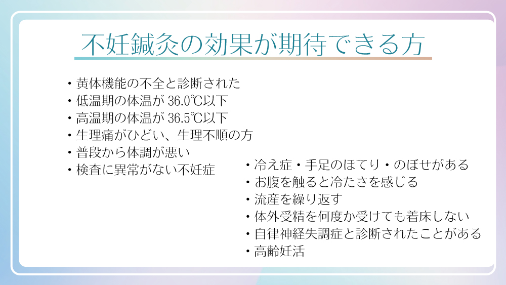 老若男女に対して効果が期待できる不妊鍼灸ですが、特に原因不明の不妊のご夫婦には効果が期待できます。