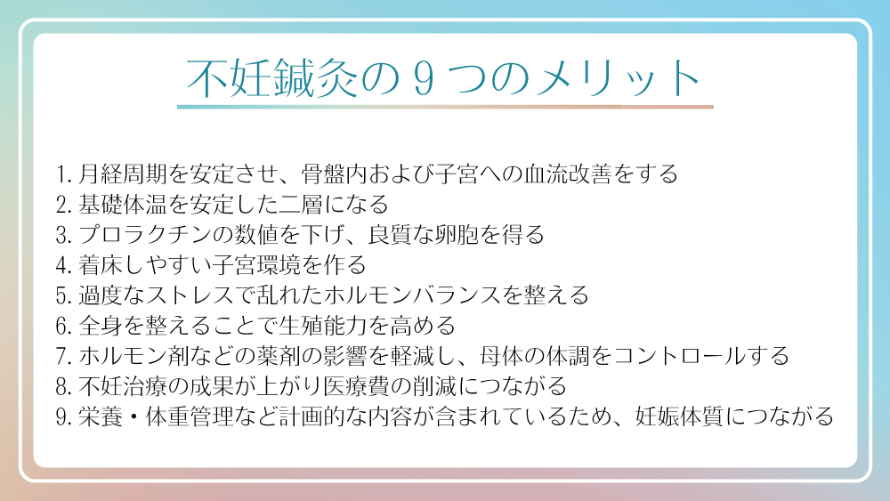 結果、卵巣や子宮は快適に活動し、ホルモンバランス、卵胞の発育、基礎体温の安定、着床・妊娠継続、そして出産へと導きます。