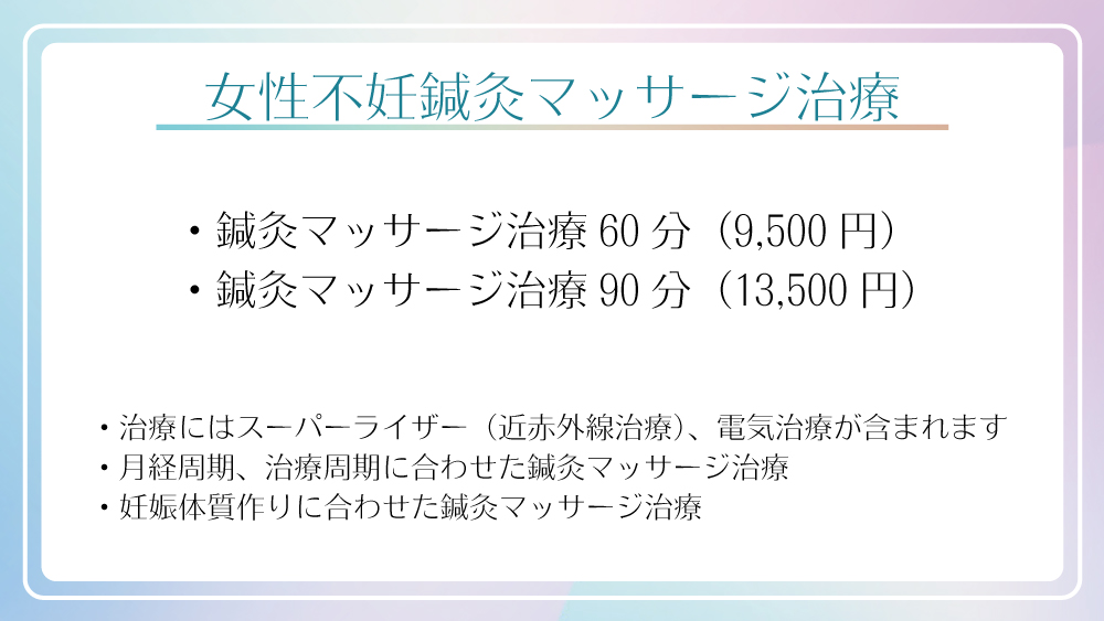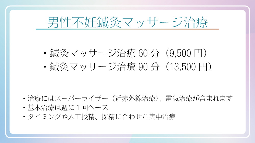男性の妊活において、精巣機能の向上と精子の質の改善、ホルモンバランスと自律神経の調整、全身の血行促進を目指し、東洋医学の知見に基づき、お一人おひとりの体質や精液所見に合わせてオーダーメイドの施術を行います。