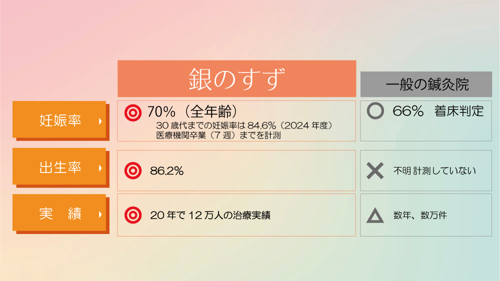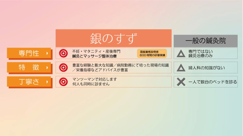 銀のすずでは、銀座で20年間、不妊治療、マタニティケア、産後ケアと女性への治療を専門で行ってきました。