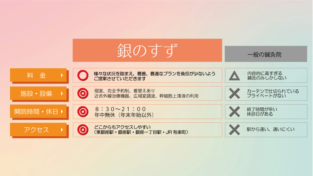 また通っていただくことになるため、立地も重要かと考え、銀座の地で治療院を構えています。